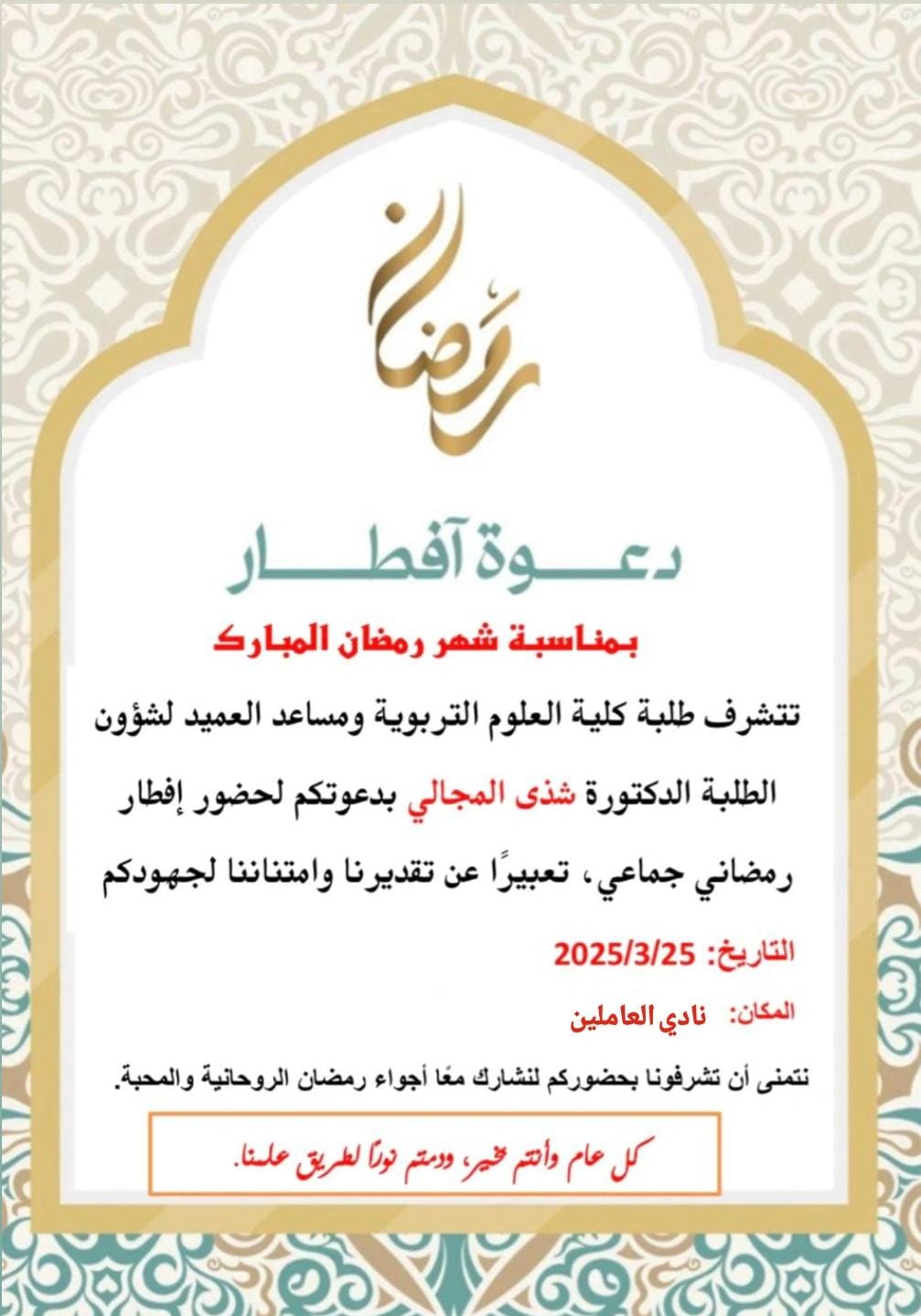 كلية العلوم التربوية تقيم فطورا جماعيا لكوادرها وطلبتها