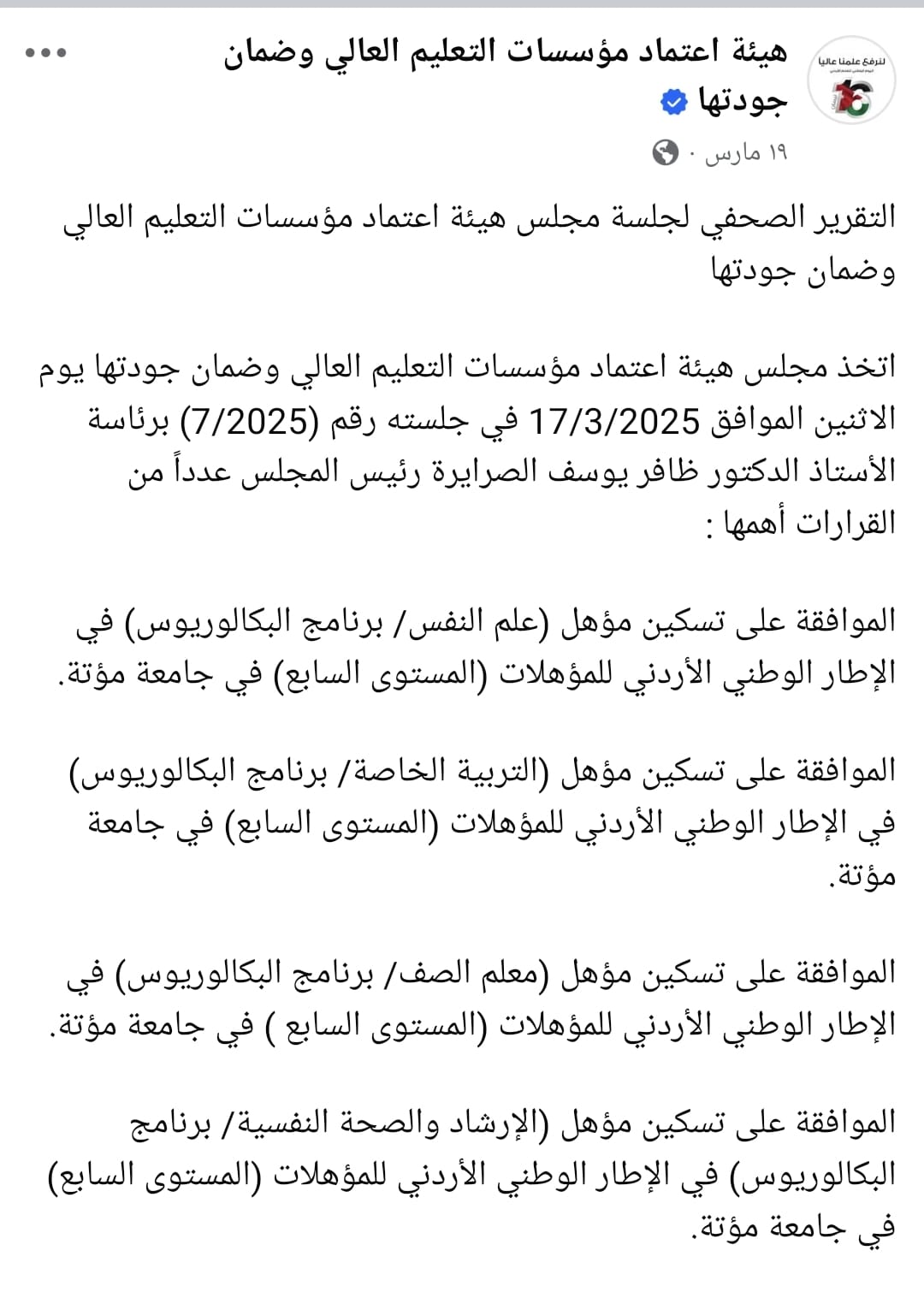 ورشة تدريبية حول تسكين المؤهلات في الإطار الوطني الأردني للمؤهلات