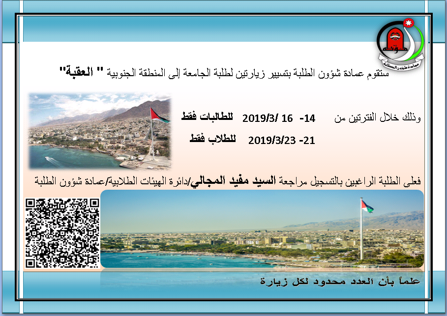 "اعلان لطلبة جامعة مؤته بتسيير رحلتين الى المنطقة الجنوبية "العقبة