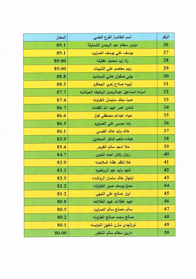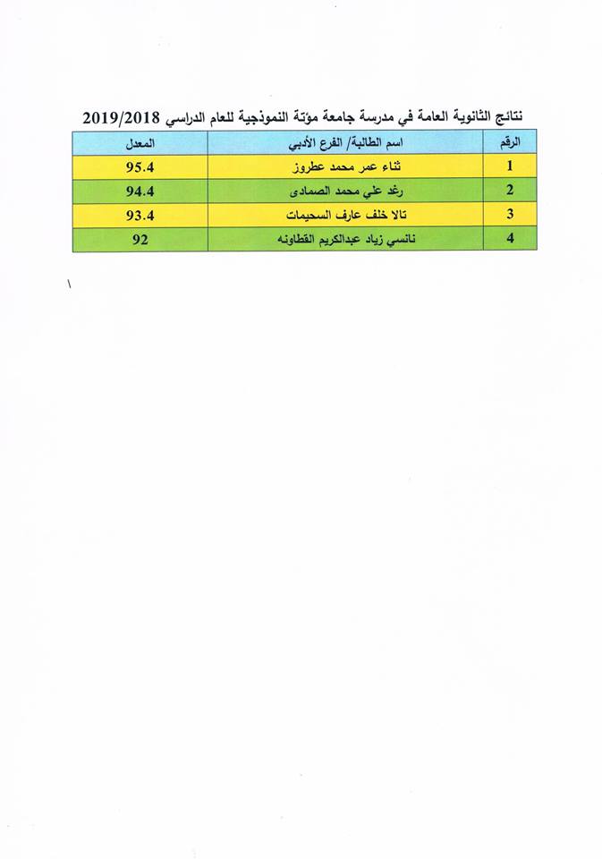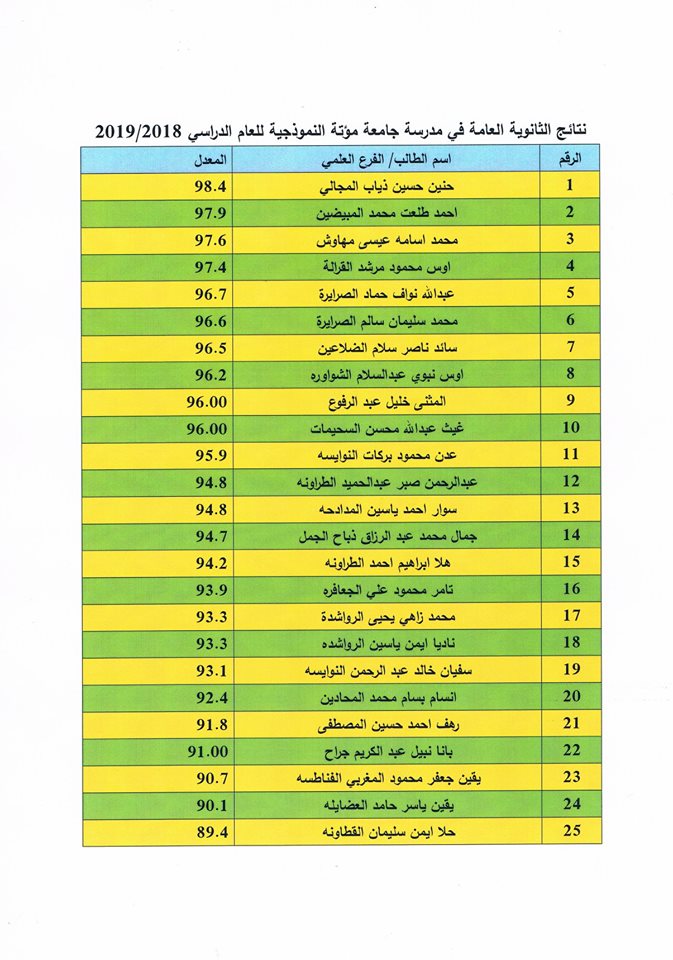 الحمد لله رب العالمين، الحمد لله على نعمه العظيمة،،،، أبارك لجميع طلبتنا الناجحين تفوقهم في نتائج الثانوية العامة، وأبارك لذويهم هذا النجاح الباهر، فقد حققت المدرسة النموذجية في هذا اليوم الموافق 25/7/2019 نتائج متميزة جداً، ففي الفرع العلمي حصل (50) طالب من أصل (87) طالب على معدل 80 فما فوق، منهم (24) طالب وطالبة حصلوا على معدل (90) فما فوق، وحصلت الطالبة حنين حسين يوسف المجالي على المركز الأول في المدرسة بمعدل 98.4 والطالب أحمد طلعت المبيضين على المركز الأول للذكور 97.9.وفي الفرع الأدبي حصل 4 طالبات من أصل 12 طالبة على معدل 90 فما فوق ، حيث حصلت الطالبة ثناء عمر عطروز على المركر الأول بمعدل 95.4.وقد قامت المدرسة بنشر أسماء الطلبة الذين حصلوا على معدل 80 فما فوق في الفرعين العلمي والأدبي. وإنني أنتهز هذه الفرصة لأقدم جزيل شكري وامتناني الى عطوفة رئيس جامعة مؤتة الأستاذ الدكتور ظافر الصرايرة على دعمه المتواصل للمدرسة النموذجية، وشكري لمجس إدارة المدرسة ممثلة برئيسها الأستاذ الدكتور فؤاد الطلافحة وأعضاء المجلس، وشكري لجميع العاملين في الجامعة، وشكري الخاص والكبير لمعلمي المدرسة النموذجية والإداريين فيها الذين ظهرت نتائج أعمالهم اليوم، فكل الشكر وعظيم الامتنان لكل من ساهم بتحقيق هذا النجاح. وللذين لم يحالفهم الحظ أعلم أن الكثير منكم قادر على أن يحقق النجاح المتميز في الدورة التكميلية فأتمنى لكم التوفيق أبنائي وبناتي وكلي ثقة بكم. (أخوكم مدير المدرسة د. عبدالقادر البطوش) .